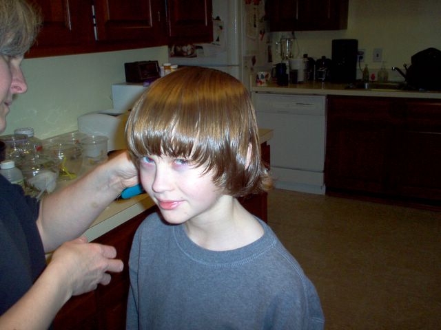 Family2005 -- Gabe, preparing for haircut & giving Dad the evil eye Jan.17, 2005